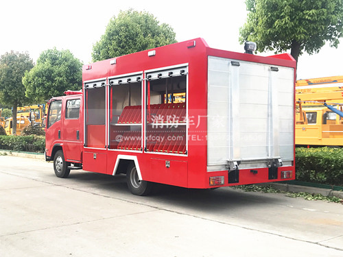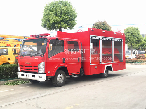 這款車(chē)型采用五十鈴700P底盤(pán)打造而成、五十鈴150馬力發(fā)動(dòng)機(jī),車(chē)輛尾部配備版遙控液壓尾門(mén)操作,方便快速的操控機(jī)器人上下車(chē),車(chē)身兩旁配備了消防水帶固定架,方便存儲(chǔ)更多的水帶、前部設(shè)定了各種消防器材或者手抬消防泵器材室。