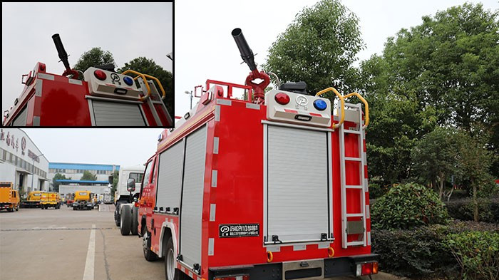 在箱體尾部上方還有兩個紅藍兩色的爆閃燈,它們的作用是讓出警時的消防車更加醒目,同時提醒行人和車輛及時避讓。箱體尾門卷閘門旁邊還有一架折疊梯子,它的作用是方便消防員到車頂取用或操作消防設備,設計很周到。這個小細節(jié)也很重要,在尾門下面可以看到兩個黃色的圓環(huán),它們的作用是能夠讓這臺泡沫消防車在必要時牽引車輛或清理障礙。