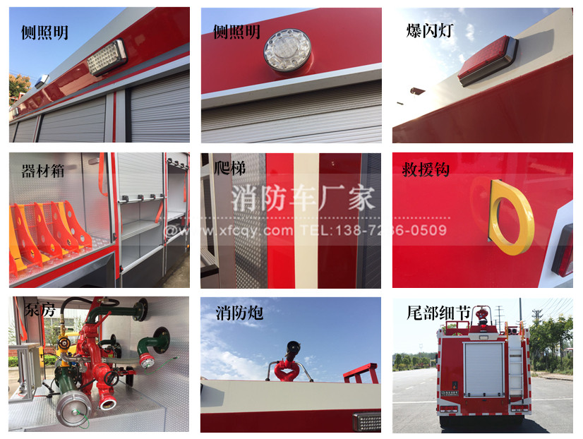 駕駛室頂部前端為長排警燈,車身后配有24V/60W火場照明燈一只,車輛兩側(cè)上方各配有紅藍相配的爆閃燈,下方安裝安全標(biāo)志燈,乘員室、器材箱、 泵房內(nèi)均裝有照明燈,加裝有100W警報器,回轉(zhuǎn)警燈開關(guān)、通訊設(shè)備預(yù)備接口。